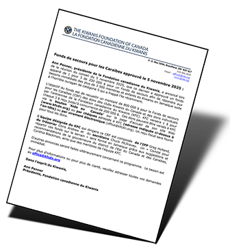 Ann Penner, présidente de La Fondation Kiwanis du Canada, a annoncé lors de la réunion du conseil du 5 novembre 2025, que ce dernier a approuvé un fonds apparié de 1 pour 3 de 200 000 $ pour un Fonds de secours afin de répondre aux besoins immédiats des plus de 3 000 membres et enfants du Kiwanis en Jamaïque suite à l’horrible ouragan de catégorie 5 qui a frappé l'île récemment.